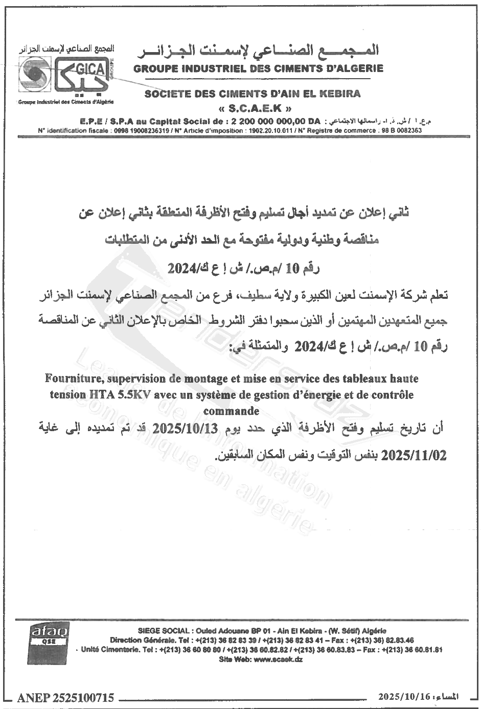 La Société des ciments de Ain El Kebira lance des appels d’offres, Nous invitons les candidats intéressés de visiter notre page d'appels d'offres.
